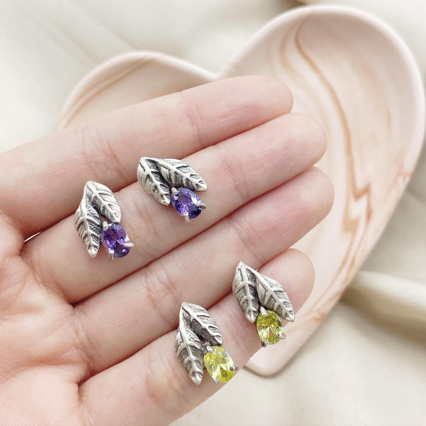 Aretes doble Hoja «Plata 925 con acabado antiguo + Amatista o Peridoto»